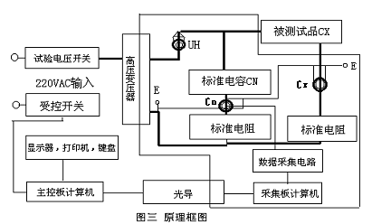 圖中除測(cè)試品CX外,其余為本儀器。細(xì)線(xiàn)框內(nèi)部分對(duì)儀器外殼隨15KV工頻高壓5分鐘,額定耐壓10KV。儀器內(nèi)附標(biāo)準(zhǔn)電容Cn,名義值為50PF,tgδ≤0.0001,耐壓10KV。高壓變壓器,額定輸出功率為1.5KVA。