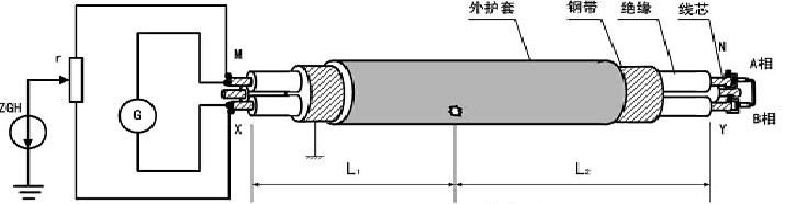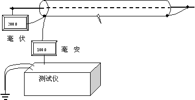 接線圖如下,在測試端的芯線和外護套上接毫伏表(萬用表毫伏檔),表筆直接與芯線和外護套接緊,不要接到儀器輸出線的夾子上,避免接觸電阻影響毫伏表的測量結果;儀器設置在連續輸出檔,調整輸出電壓,使輸出電流達到A1(整數如100.0mA),這時讀取毫伏表上的讀數V,由于電壓表輸入電阻很高,因此,流經項線的電流很小,可以認為毫伏表的電位測量端到故障點的電位,因此,該讀數即為測量端到故障點兩點的電位差V1。再將儀器移到電纜的另一側(末端)進行測量,讓輸出電流值與始端測量時的數值一致,這時毫伏表的讀數為V2;