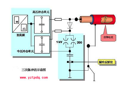 三次脈沖法是二次脈沖法的升級。其方法是首先在不擊穿被測電纜故障點的情況下,測得低壓脈沖的反射波形,緊接著用高壓脈沖擊穿電纜的故障點產生電弧,在電弧電壓降到一定值時觸發中壓脈沖來穩定和延長電弧時間。之后再發出低壓脈沖,從而得到故障點的反射波形,兩條波形疊加后同樣可以發現發散點就是故障點對應的位置。由于采用了中壓脈沖來穩定和延長電弧時間,它比二次脈沖法更容易得到故障點波形。相對于二次脈沖法由于三次脈沖法不用選擇燃弧的同步時長,操作起來也更加簡便。三次脈沖代表性儀器為:三級多次電纜故障測試儀。