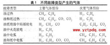 運行變壓器內常發生的氣體故障主要有過熱性故障和放電故障兩大類,故障類型及其能量密度,主要決定于故障的性質,不同故障類型產生的氣體見表1。