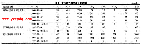 武漢供電局曾對局轄珞珈山變電站3號主變、江漢路變電站1號主變和花山變電站1號主變進行周期取樣或事故取樣,并用TPSPY-Q氣相色譜儀對其進行分析,其數據見表2。