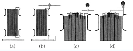 鐵芯接地方式如圖1所示。圖1中(a)是一種最簡單的接地方式,在油箱內部完成,在同一側的上軛和下軛插入接地銅帶,上軛接地片與上夾件相接,下軛接地片與下夾件相接再與墊腳相接而接地,上夾件是通過鐵芯而接地的。這種方式多用于中等容量或較小容量的變壓器。圖1中(b)是鐵芯接地片與上夾件連結,然后經套管引出油箱外部再接地,下夾件與墊腳經箱底接地,鐵芯與油箱間是絕緣的,這種結構的上夾件不能與油箱接觸。圖1中(c)和(d)均用于鐵芯總厚度很大的大型變壓器,這種變壓器往往在疊片組中每隔一定厚度放置一層油隙,以改進散熱性能,或每隔一定厚度墊一層絕緣紙以降低渦流損耗。這時鐵芯被隔開成若干組,切斷了電容接地的路徑。為求得電位的盡可能均勻,要把各個被隔開的片組用∩形銅帶串聯起來。如鐵芯厚度很大時,采用(d)方式,即由中央部分接地,可使電位更均勻些。