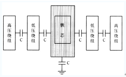 在變壓器正常運行中,帶電繞組及引線與油箱間構成的電場為不均勻電場,鐵芯和其它金屬構件就處于該電場中。圖2示出了變壓器鐵芯不接地時的斷面示意。由圖2可見,高壓繞組與低壓繞組之間、低壓繞組與鐵芯之間、鐵芯與大地(變壓器油箱)之間都存在著寄生電容,帶電繞組將通過寄生電容的耦合作用使鐵芯對地產生一定的電位,通常稱為懸浮電位。由于鐵芯及其它金屬構件所處的位置不同,具有的懸浮電位也不同,當兩點之間的電位差達到能夠擊穿其間的絕緣時,便產生火花放電,這種放電是斷續的,放電后兩點電位相同,但放電立即停止,然后再產生電位差,再放電……。斷續放電的結果使變壓器油分解,長期下去,逐漸使變壓器固體絕緣損壞,導致事故發生。為避免上述情況發生,國標規定,變壓器鐵芯和較大金屬零件均應通過油箱可靠接地,20 000 kVA及以上的變壓器,其鐵芯應通過套管從油箱上部引出并可靠接地。具體做法是將變壓器鐵芯與變電站的接地系統可靠連接。這樣,鐵芯與大地之間的寄生電容被短接,使鐵芯處于零電位,這時在地線中流過的只是帶電繞組對鐵芯的寄生電容電流。對三相變壓器來說,由于三相結構基本對稱,三相電壓對稱,所以三相繞組對鐵芯的電容電流之和幾乎等于0。