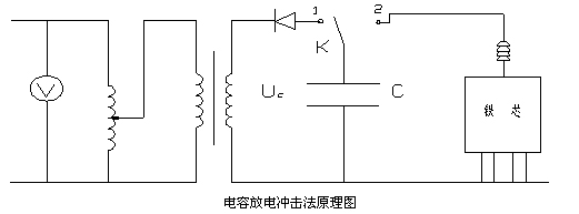 對這種情況,可采用電容沖擊放電法來進行排除。圖4為電容充放電電路,使用時首先合雙向開關K到1側,用直流高壓發生器對電容C充電,充電后快速把開關K合到2側,對變壓器故障點放電。對1號主變實施了第一次沖擊,有間歇地反復進行了7次沖擊后,測試鐵芯對地絕緣電阻為550MΩ,鐵芯接地故障得到了消除。