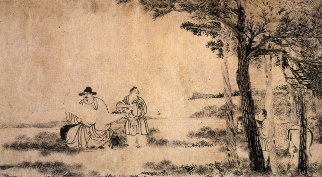 在故宮博物院眾多藏品中,有一幅引人注目的《云中送別圖卷》。畫面上一人峨冠溥帶,獨(dú)坐松坡之上,一僮子侍后。兩人手展畫卷,峨冠者凝神而視。樹(shù)下一僮子手牽鞍馬,整裝待發(fā)。人物形神兼?zhèn)?,衣紋線條流暢。左方叢林石壁,筆法粗放,墨氣淋漓。這幅兼工帶寫的紙本墨筆畫,收人了《中國(guó)繪畫史圖錄》,作者就是明代著名畫家陶成。
