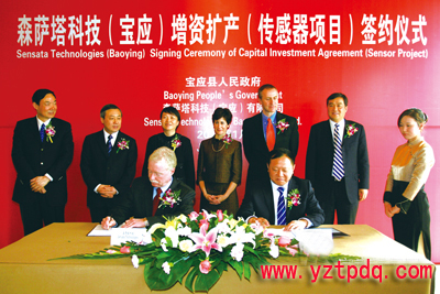 1月19日中午,美國森薩塔科技公司在揚州與我縣簽訂增資擴產協議,市委書記、市人大常委會主任王燕文,市委副書記、市長謝正義,副市長聞道才,森薩塔科技總裁兼首席運營官瑪莎·蘇利文女士,森薩塔科技執行副總裁、首席財務官杰夫·科特先生,森薩塔科技運營高級副總裁迪克·丁先生,縣委書記、縣人大常委會主任仲生,縣委副書記、縣長王庭國,縣委副書記周玉寶,副縣長顧長榮以及市經信委、商務局、質監局、海關、商檢局和我縣相關負責人等出席簽約儀式。