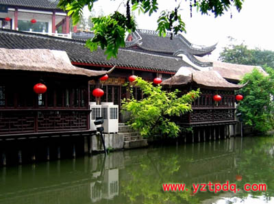 曲徑湖水之間,是水繪閣和香影廊,閣與廊之間又有曲欄勾連,皆沿湖而筑,水繪閣與香影廊房屋形式雖不大,卻極富層次,南部臨水處茅屋草頂,陽光一照,滿頂金黃,與碧水綠揚相映成趣。房內花隔為壁,方格支窗,臨水處,又有美人靠椅,閣與廊一半建于水上,人坐其間,如同鳧在湖上一般。