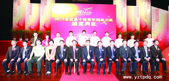 今年,寶應縣委、縣政府研究決定開展2012“寶應縣十佳青年創業之星”評選活動。本次活動得到了社會各界的熱烈響應,經過宣傳發動,推薦申報、確定正式候選人、社會公示等階段,最終評選出10名“十佳青年創業之星”和10名“十佳青年創業之星”提名獎。江蘇蓮馨園食品有限公司董事長萬作知、江蘇海創電氣科技有限公司總經理王明海、江蘇幻網軟件科技有限公司董事長劉杰、江蘇寶樂實業有限公司總經理楊軍勇、揚州宇新管業有限公司總經理金梅艷、江蘇中恒鋁業有限公司總經理戴玉國、揚州億嘉鐵路材料科技有限公司董事長陳勇、上海景德高級汽車維修有限公司董事長陳道于、揚州沃爾科技有限公司總經理楊成、揚州東安管件有限公司董事長謝才紅當選為2012年“寶應縣十佳青年創業之星”。寶應縣委書記、縣人大常委會主任仲生在頒獎典禮上發表了熱情洋溢的講話,代表縣委、縣人大、縣政府、縣政協向獲得縣“十佳青年創業之星”的青年企業家們表示熱烈祝賀,向全縣廣大青年朋友致以節日的問候。他說,創業是時代發展的主題。近年來,全縣廣大青年大力弘揚“三創三先”新時期江蘇精神,以創業發展為己任,開拓進取,奮力突破,闖市場、擴銷路,抓創新、搞技改,在創業、二次創業道路上勇當排頭兵,展現了青年人的風采。