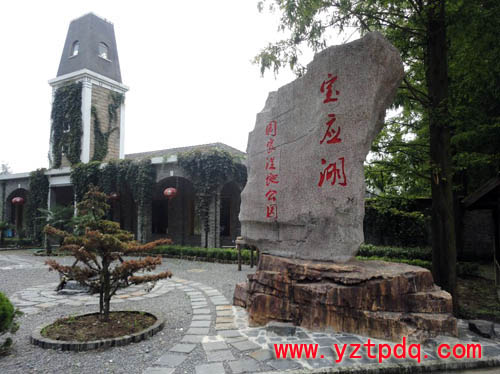 八寶亭坐落在城中心的縱棹園里。進了素磚。高瓦的園門,走過垂柳依依的石路,踏上溪流涓涓的小橋,那飛檐翹角、凌然欲飛的八寶亭就躍入了你的眼簾。遠遠地,趙樸初先生書寫的餾金大字“八寶亭”赫然醒目。拾階而上,佇足亭內,八面來風,近聞鳥語花香,遠眺旭日東升,悠悠然如臨仙境。