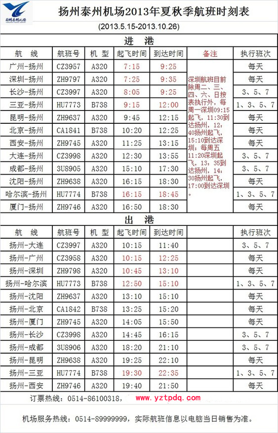 2013年5月15日起,揚(yáng)州泰州機(jī)場(chǎng)開始執(zhí)行最新夏秋季航班時(shí)刻表(具體如下表)。市民如有疑問(wèn),請(qǐng)打機(jī)場(chǎng)服務(wù)熱線0514-89999999咨詢。機(jī)場(chǎng)訂票熱線為0514-86100318。