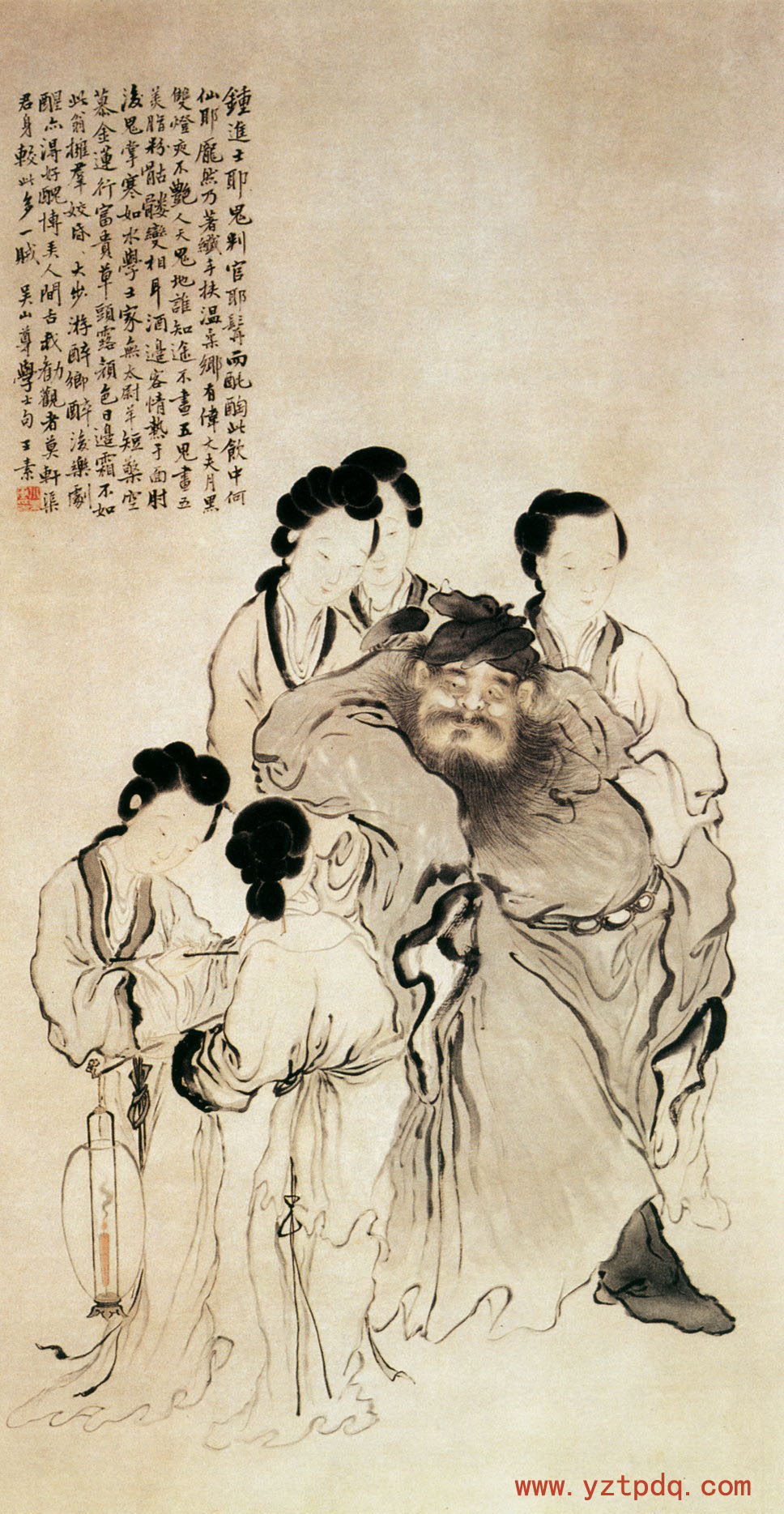 【鐘馗圖】描繪五仕女簇擁著酒醉的鐘馗夜歸的情景。鐘馗作張髯大腹、步履蹣跚之狀,雙目斜視,左右脅各有攙扶侍女一人,后側一侍女護送。侍女頭部發髻烏黑光亮,臉部敷脂抹粉,體態輕盈,衣褶飄逸。鐘馗寬袍束帶,以淡墨疾筆寫衣褶,作蘭葉描。人物畫法,以工帶寫。左上自錄吳山尊雜詩一章,詩意揭露世態炎涼,不如盡醉為樂。此畫是王素人物畫中的佳作。