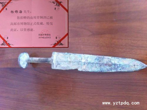 高郵市臨澤鎮11歲少年楊俊熙,到河邊洗手時,意外發現一柄銹跡斑斑的古劍。古玩收藏愛好者聞訊前來,不斷抬高價碼“收購”,楊俊熙的父親楊錦海不為所動,請來專家鑒定,得知這是商周時期的青銅劍文物時,毫不猶豫地捐獻給高郵博物館。近日,高郵市文物局、高郵市博物館工作人員專程前往臨澤鎮,給楊家父子送去收藏證書和獎金,表彰這種愛護文物、保護文物的主人公意識。