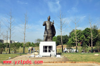 據施工人員介紹,吳王夫差雕塑設置在廣場東西中軸線的西端,材質為青銅,基座高度約2.5m,雕塑高約6m,總體高度約8.8m。據工程負責同志介紹,吳王夫差雕塑今年5月13日確定了中標供應商,中標供應商在吸納評標專家和部分揚州文史專家的意見后,對雕塑的造型、服飾、面部神態等細節進行了完善。據悉,這次先行吊裝的為1:1的玻璃鋼雕塑,重約1噸。為什么不直接吊裝青銅雕塑?專家告訴記者,這是想經過一定時間的現場展示,來征集市民的意見,在征集市民意見截止之日起60天內,完成最終的青銅雕塑制作和現場安裝。