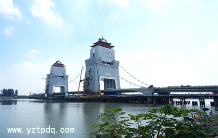 萬福大橋橫跨淮河入江水道主河道廖家溝,全長664米,主跨188米,是我國首座塔梁古建相結合景觀橋,也是揚州城市地標性建筑。主橋為雙塔自錨式懸索橋,橋型融現代美與古典美于一體,總體風格為亭臺樓閣,設計獨特新穎,造型古樸典雅,與揚州城市歷史悠久、文化燦爛的厚重氣質相得益彰。萬福大橋是我市一座觀光平臺。登上塔樓俯瞰,南面的長江和夾江,北面的邵伯湖和高郵湖,壯闊的江淮生態大走廊一覽無余;江都老城和揚州古城,廣陵新城和生態科技新城也都盡收眼底。如果天氣晴朗,長江對面的鎮江市的高山也可以看到。