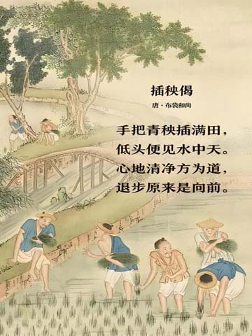 “手把青秧插滿田,低頭便見水中天。六根清凈方為道,退步原來是向前。”插秧偈