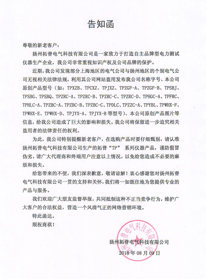 為此,我公司特別提醒新老客戶,在選購產品時要仔細甄別,請認準揚州拓普電氣科技有限公司生產的拓普“TP” 系列儀器產品,謹防假冒偽劣。請廣大代理商和終端用戶注意以上情況,以免給您造成不必要的麻煩和損失。
